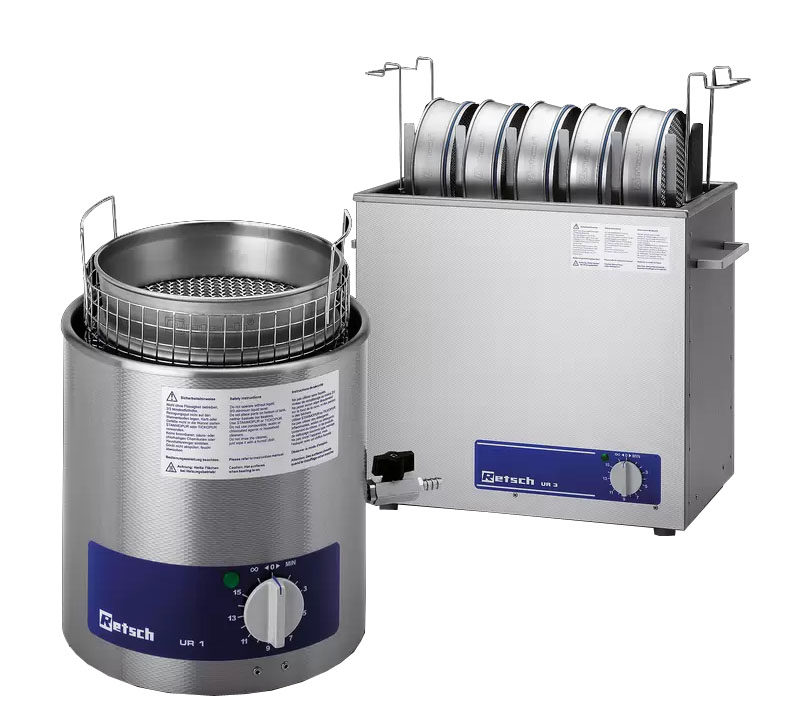 UR 1适用于直径不超过203 mm的分析筛,UR 2 适用于直径不超过400 mm的分析筛,UR 3适用于一次性对5个直径为200/203 mm的分析筛进行清洗。在超声波池内进行的清洗可以避免手工清洗对分析筛造成的损伤,从而有助于延长分析筛的使用寿命。
