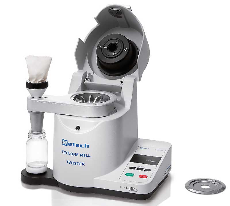 旋风磨TWISTER是专为食品、饲料等需要近红外检测的样品制备。转刀在研磨腔中高速旋转产生气流,通过旋风分离器将样品带入收集瓶。气流防止升温,从而保持样品的水分。 环筛保证每次做样都是最佳的粒度分布,所以没有必要重新校准近红外光谱仪。转速有3档选择,可满足多种样品要求。在旋风分离器的作用下,仪器的清洁更方便快速。 RETSCH的旋风磨能保证制样结果的重复性,令近红外分析的样品制备得到可靠的分析结果。