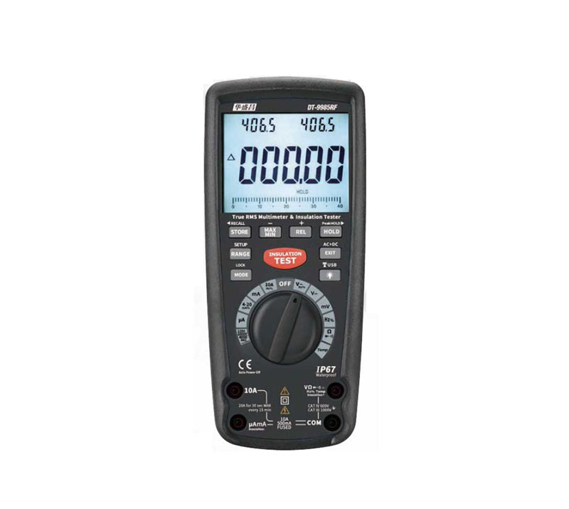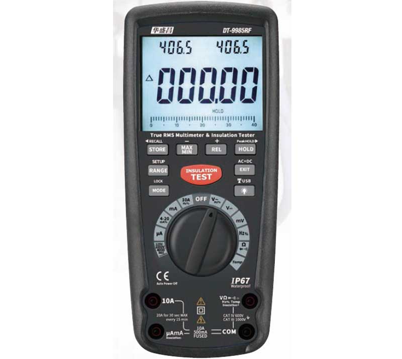 DT-9985RF二合一专业真有效值绝缘万用表是一款集绝缘测试和真有效测试的高精度专业多用万用表,双注塑机壳、密封性能极佳,IP67防水防尘设计。广泛应用在马达、电缆、变压器、机械设备、电力电气等行业。